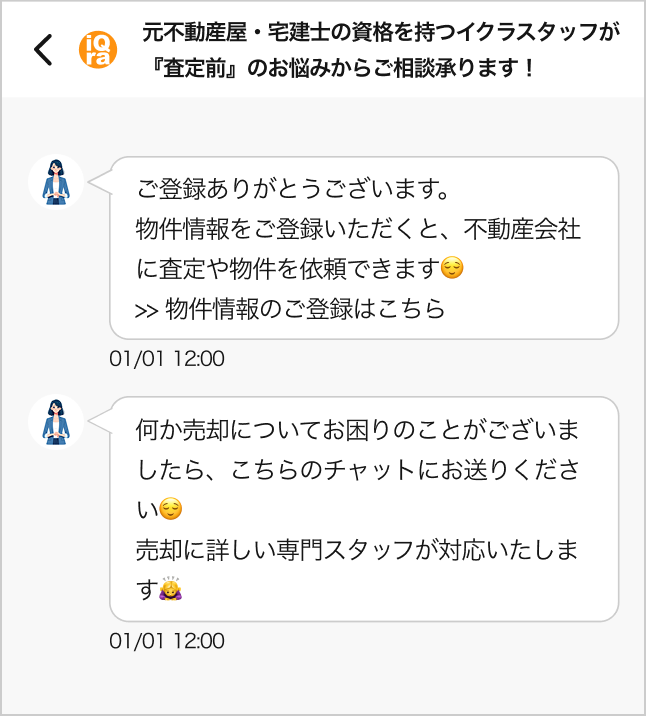チャットでのレスポンスも早く、初めての不動産売却でわからない事だらけだったのですが、的確に質問にも回答いただき、大変ありがたかったです。 勇気を出して相談してみて良かったです。ありがとうございました。50代男性
